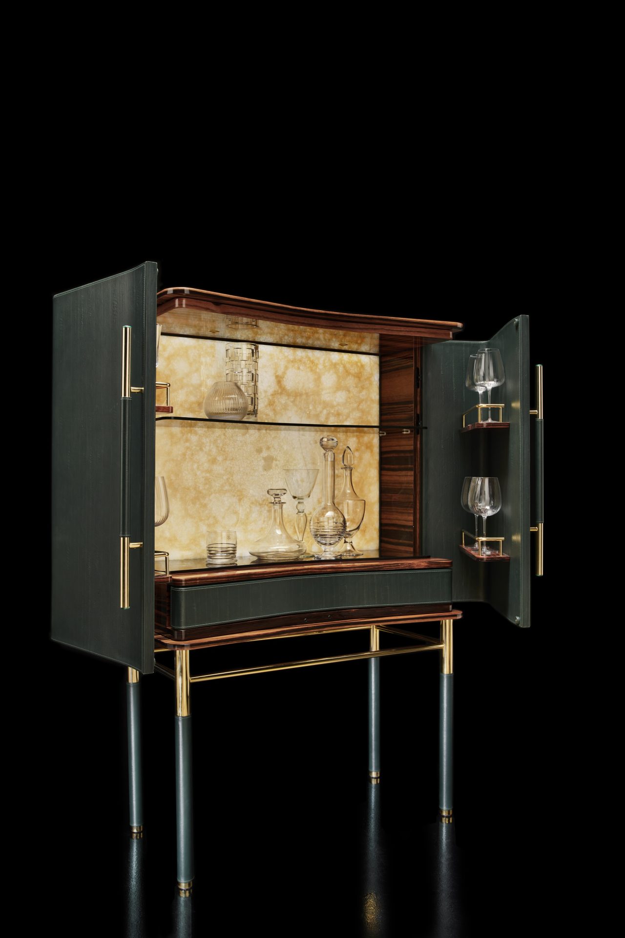 Baron Bar Cabinet is characterized by a strong architectural imprint. The fine craftsmanship of the upholsteries and finishes emphasizes the poetry of the shapes and the great furniture-making tradition. The Baron Bar Unit features an extremely functional drawer with upholstered compartments, whose door is upholstered with leather. The wooden side shelves and the central glass shelves offers comfortable surfaces. Great scenery effect the back-lighted marble option for the internal back.