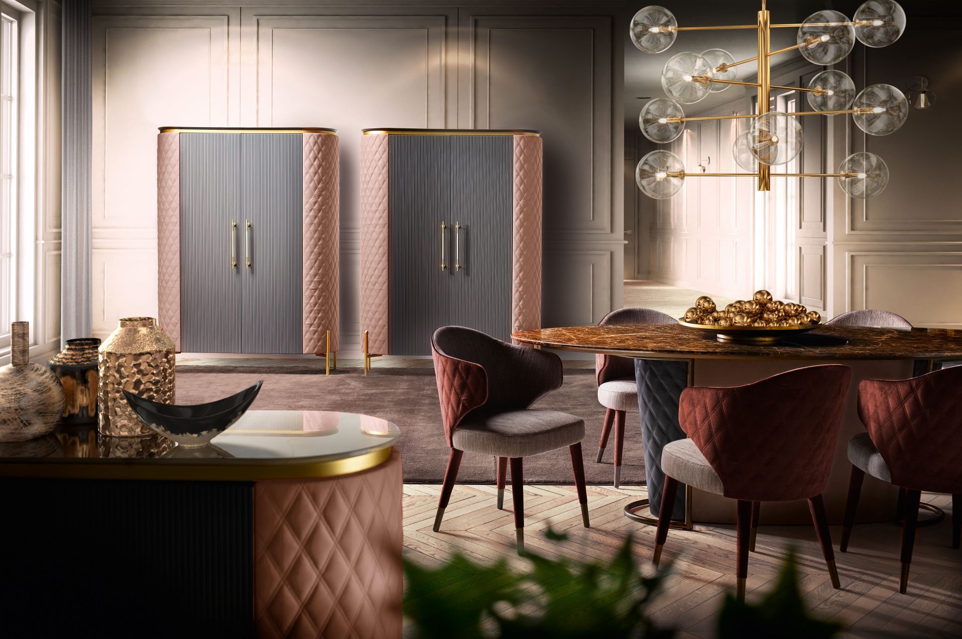 The Brera wooden cabinet is an elegant storage unit. Its central glass doors allow visibility of the wooden-clad interiors, furnished with four glass shelves. The wooden frame is upholstered in leather or fabric on the semi-circular sides. The metal details are in a gold/champagne or graphite grey finish.