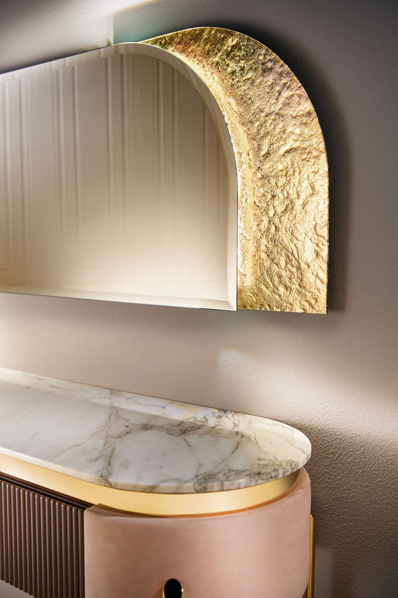 The clear and minimal design of the Minia Consolle juxtapose the preciousness of the chosen materials: marble, wood, glass and stainless steel, creating a perfect mix of sober elegance.
